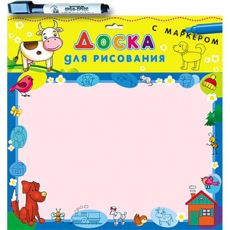 При помощи доски для рисования и прилагающегося к ней маркера Ваш малыш сможет создать любую картину. А начать можно с перерисовывания иллюстраций, расположенных по краям доски. Сначала ребенку можно предложить назвать персонаж или предмет на доске, а затем срисовать его.