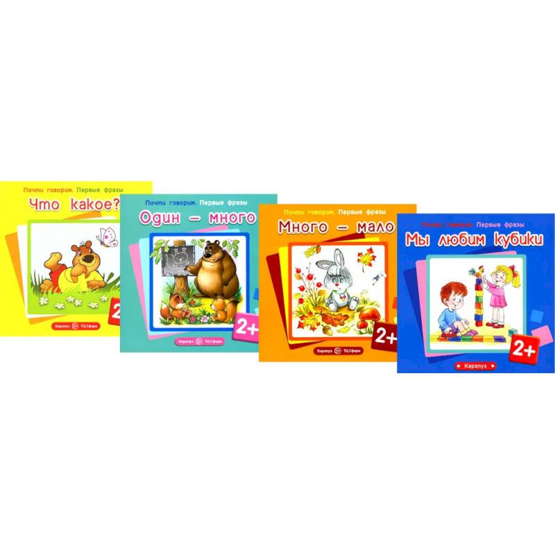 Комплект 'Почти говорим №2 ' содержит книги:   'Мы любим кубики'  Почитали - поиграли!  Пусть кубики будут рядом! Это такая книжка: читаем и играем одновременно!  Дети изначально не знают, как именно играть. Мы попробуем ненавязчиво им это продемонстрировать в книжке на примерах игры Вани и Ани.  Последовательность в освоении строительного материала такова: знакомим с назначением каждой детали (кубик, кирпичик, 'крыша' и т.д.), потом предлагаем сюжеты для игры - 'дорога', 'дача, деревня', 'чаепитие кукол'.  Сначала играют Ваня и Аня, а потом и вы со своим ребёнком!  'Много-мало','Один-много', 'Что такое?'  В чем развивающий эффект.  Может ли он быть в подобных незатейливых текстах? Несомненно! Именно такими они и должны быть - простыми, короткими, понятными. Эффект усилится, если вы будете не читать, а эмоционально проговаривать 'от себя', по возможности включая мимику и жесты и при этом находясь в плотном тактильном контакте - тут погладили, там чмокнули, здесь покачали на коленях и т.д. Особенно важно понимать, что дети разные, а текст один. Прислушивайтесь к ребенку, вовремя 'вворачивайте' свои слова и комментарии, помогающие малышу быть сосредоточенным на просматриваемом эпизоде. Возвращайтесь к ранее прочитанному. Детям это крайне необходимо!